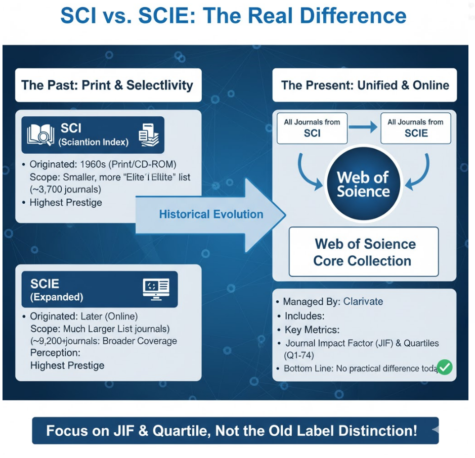 The essential difference is primarily historical and relates to the original format and size of the index. For researchers today, relying on the most current data from Clarivate (the company that manages these indexes), there is effectively no significant difference in quality or prestige between journals listed in SCI versus SCIE. Both are now integral parts of the premier Web of Science Core Collection.