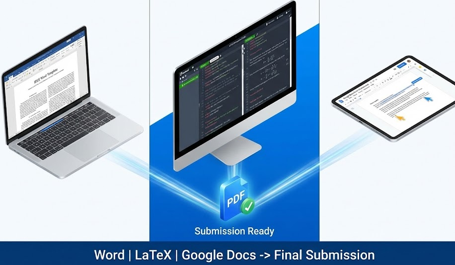 Prompt: Aclean, split-screen composition showing the three stages of academic writing.On the left, a Microsoft Word interface with a structured 2-column paper. Inthe middle, a dark-mode code editor showing LaTeX syntax. On the right, aGoogle Docs interface with collaborator cursors. All three merge into a single,glowing PDF icon in the center labeled "Submission Ready."Professional, blue and white color scheme, isometric style.
